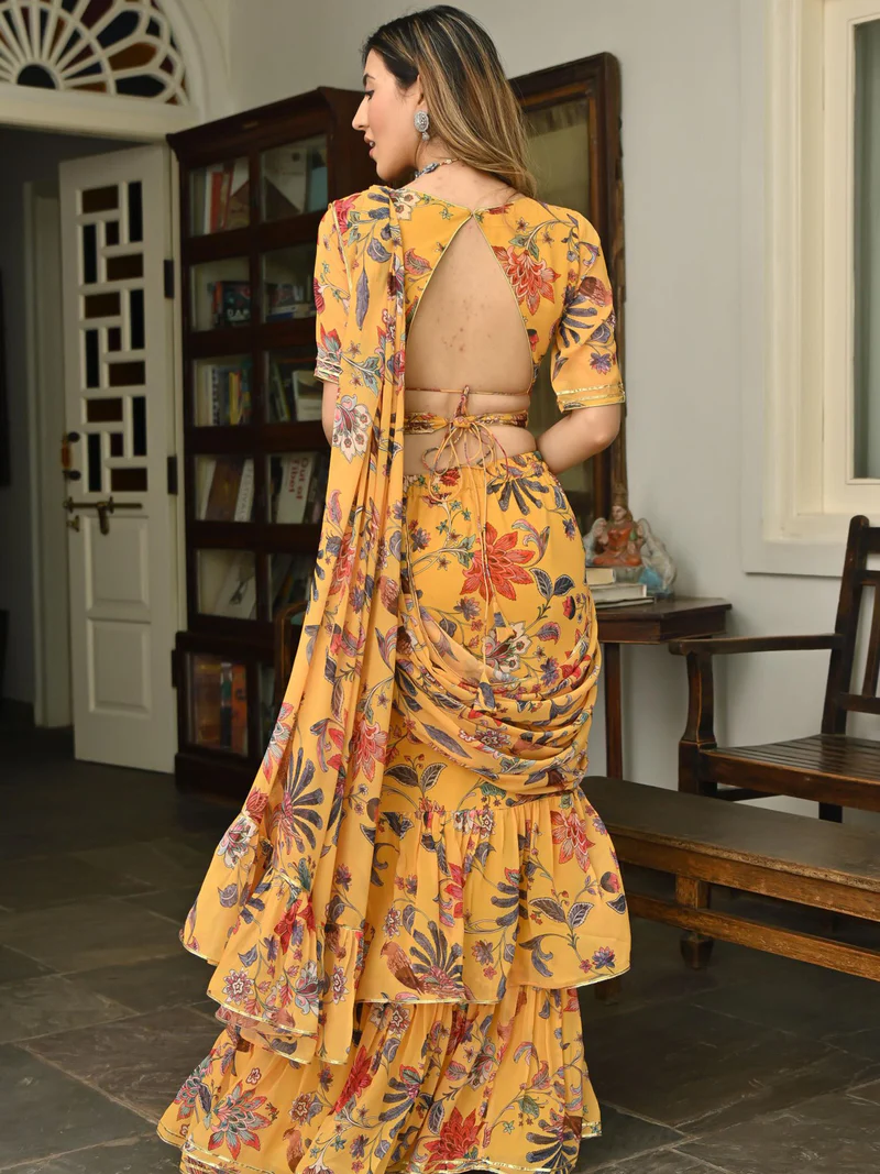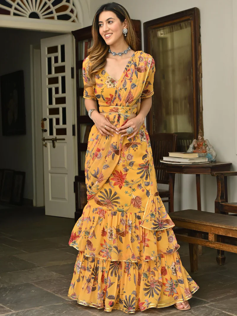 Yellow Printed Ruffle saree